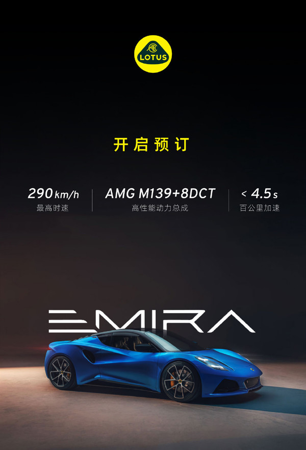 8月20日,路特斯EMIRA正式开启预订,这是路特斯最后一款燃油跑车,采用AMG M139+8DCT高性能动力总成,最高时速可达290km/h,百公里加速度小于4.5s。