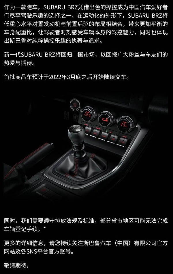 9月8日消息,全新斯巴鲁BRZ宣布重回中国市场,首批车型预计于2022年3月底开始交车。不过,官方表示,受制于排放法规,该车在部分省市暂时无法完成车辆登记手续,目前,北京、天津、上海、广东、河北等省市区域已经实施国六b排放标准,因此全新斯巴鲁BRZ无法在这些区域完成车辆登记手续。