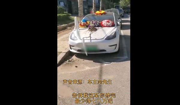 在反复交涉下,特斯拉工作人员回复称只需更换两根线路,但需对电池、电机等进行检测,费用还是要七八万。向先生一气之下就在特斯拉门店外摆起了花圈。