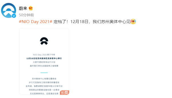 蔚来NIO Day定档了!12月18日在苏州奥体中心举行