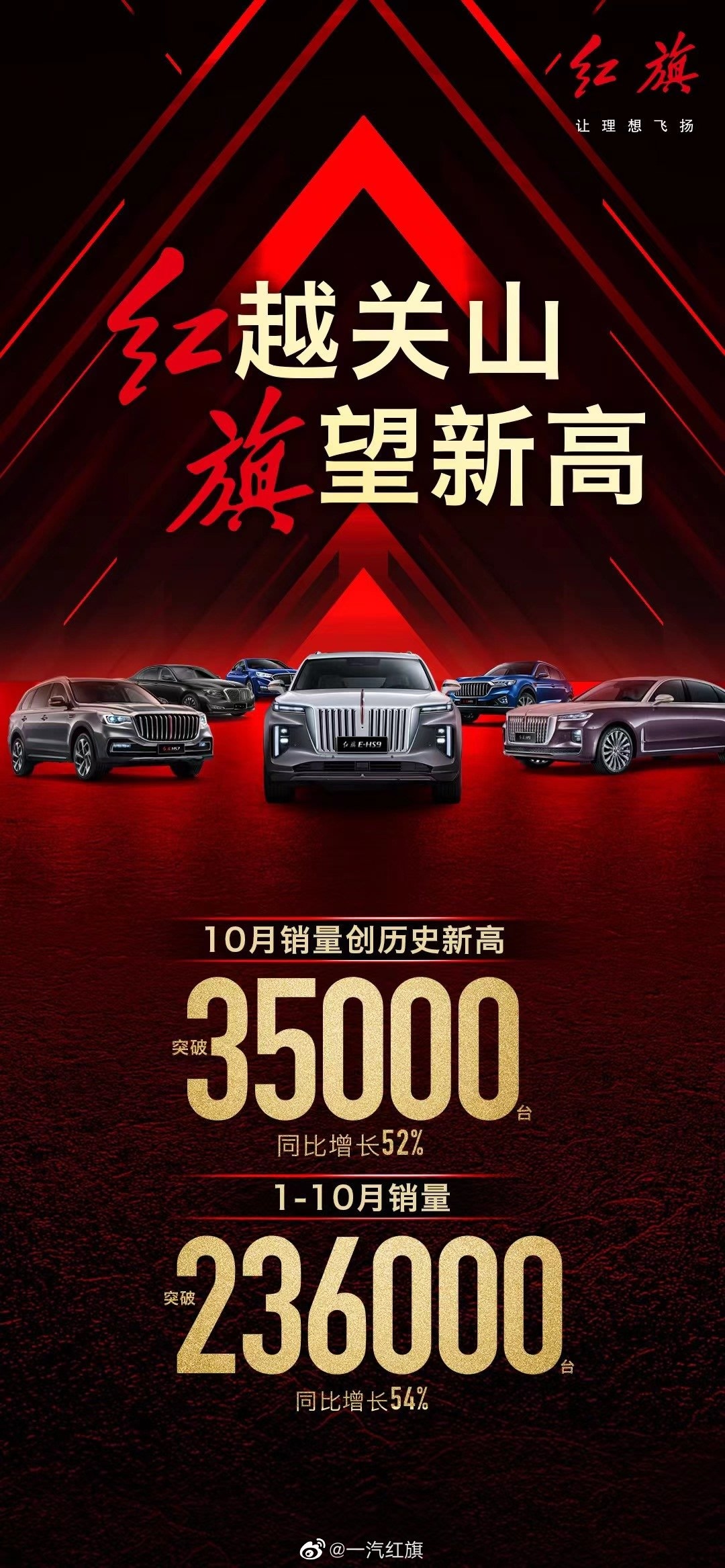 谈及红旗汽车,更多的印象是豪车。10月份刚刚过去,新红旗近日就公布了10月销量数据。数据显示,红旗1-10月销量突破236000台,同比增长54%,其中10月销量突破35000台,同比增长52%,创造品牌单月销量新纪录。