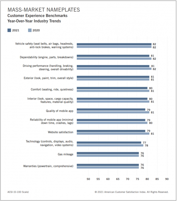 据悉,该研究分析了车辆安全性、可靠性、驾驶性能、外观、舒适性、内饰等各个方面,结果显示,2021年,除了对汽油里程的满意度和较为稳定的保修率这两项指标外外,绝大多数指标的客户满意度都比去年有所下降。