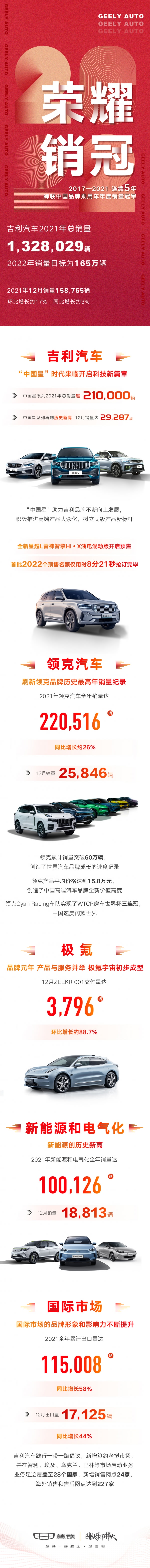 自主品牌五连冠!吉利汽车2021年总销量超132.8万辆