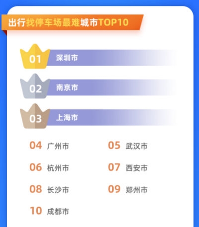 具体来看,找停车场最难的城市分别是,深圳市、南京市、上海市、广州市、武汉市、杭州市、西安市、长沙市、郑州市和成都市。整体来看,南方城市停车难的现象高于北方城市。