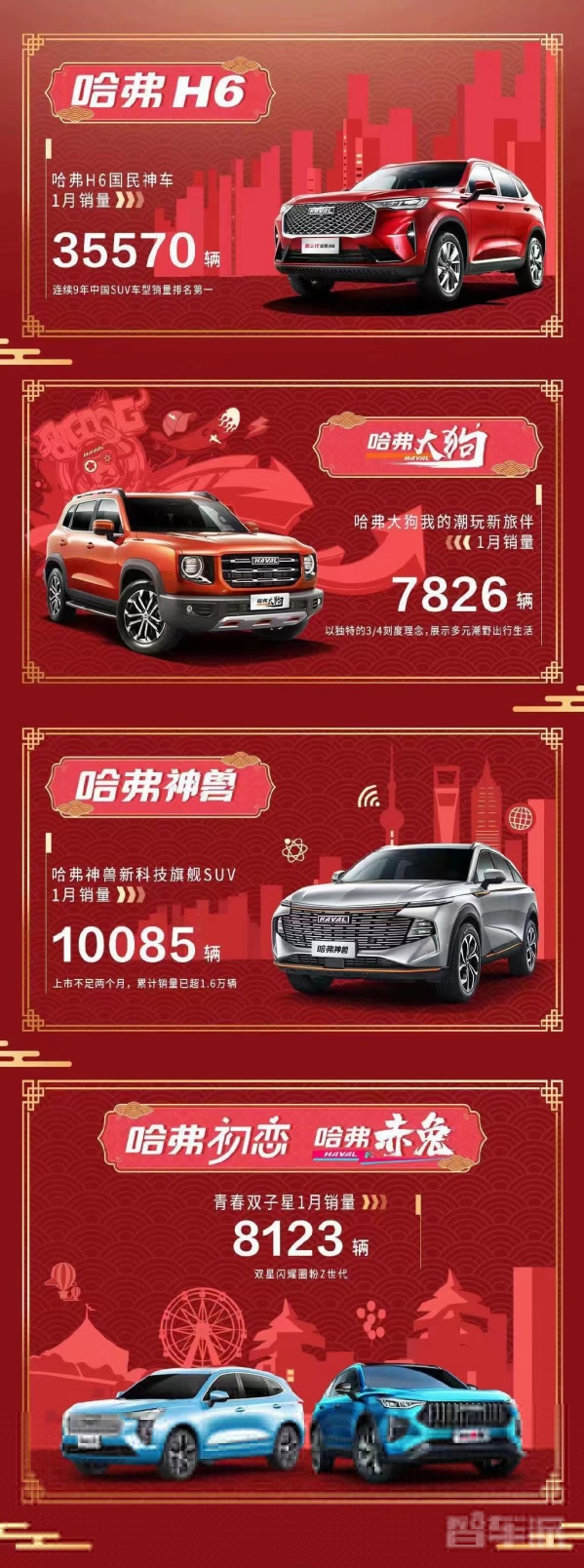 2月15日,哈弗SUV公布了其1月汽车销量:哈弗SUV喜迎新年开门红,2022年1月销量突破7万辆!国民神车H6销量突破3.5万辆,连续9年中国SUV车型销量排名第一,占总销量的一半。