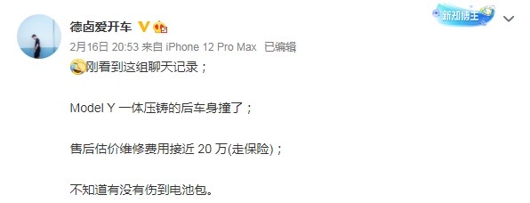 2月17日消息,据微博上一位汽车博主说,一辆Model Y一体压铸的后车身撞了后,特斯拉给出的售后估价维修费用接近20万元(走保险),这让车主感到“震惊”。