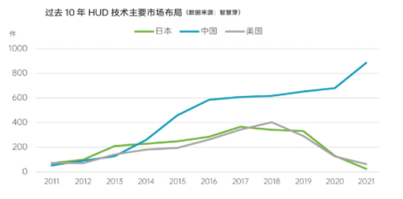就中国市场而言,2014年后,中国开始迅速成长为全球最受关注的HUD技术应用目标市场。此后,中国连续7年成为全球HUD技术领域专利布局的第一市场。截至2021年底,全球约30%的专利布局在中国市场。