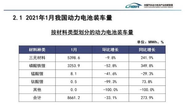 而在装车量方面,磷酸铁锂电池和三元锂电池都实现了大幅度的同比增长。1月,中国动力电池装车量共计8.7GWh,同比增长273.9%。三元锂电池、磷酸铁锂电池装车量分别为5.4GWh和3.3GWh,分别同比增长241.9%和349.8%。