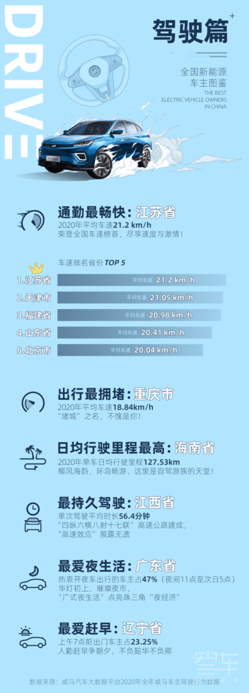 在驾驶方面,江苏省的车主通勤最畅快,2020年平均车速达21.2km/h;其次是天津市,平均车速达21.05km/h;福建省的平均车速达20.98km/h,位列第三;山东省和北京市均进入前五。有通勤最畅快的省市,自然也有出行最拥堵的城市。威马的数据显示,重庆市是最拥堵的城市,2020年平均车速为18.84km/h。还有一个很有意思的数据,最爱夜生活的省份是广东省,热衷开夜车出行的车主占47%(夜间11点至次日5点)。而辽宁省是最爱赶早的省份,上午7点前出门车主占23.25%。