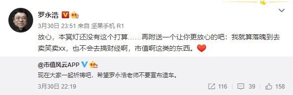 小米宣布造车更加印证了智能汽车是现在的一个风口,说到风口,不少网友就想起了罗永浩——靠抓住直播带货这个风口而还清债务的人。小米宣布造车后,有网友调皮地称:“现在大家一起祈祷吧,希望罗永浩老师不要宣布造车”。对此,罗永浩回应称,“放心,本冥灯还没有这个打算……再附送一个让你更放心的吧:我就算落魄到去卖笑,也不会去搞财经、市值这类的东西。”
