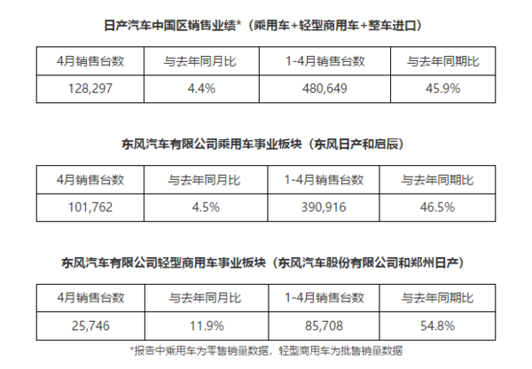 今年1-4月,日产汽车中国区累计销量为480649台,同比增长45.9%。乘用车事业板块(包括日产和启辰品牌)累计销量为390916台,同比增长46.5%。轻型商用车事业板块(包括东风汽车股份有限公司和郑州日产)累计销量为85708台,同比增长54.8%。