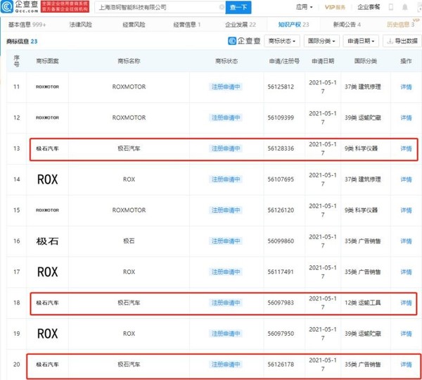 日前,小米生态链公司石头科技关联公司上海洛轲智能科技有限公司申请注册“极石汽车”商标,国际分类涉及“科学仪器”、“运输工具”、“广告销售”等,目前商标状态为“注册申请中”。企查查信息显示,该公司成立于2021年1月,注册资本1000万元人民币,法定代表人及最大股东为昌敬(石头科技创始人兼CEO)。