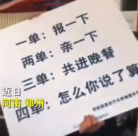 近日,一则关于汽车公司低俗营销的视频在网上疯传。视频显示,该公司的一名女性销售员举着一块“广告牌”,上面写着:一单,报(抱)一下;两单,亲一下;三单,共进晚餐;四单,怎么你说了算。在这条视频里还有一份微信聊天截图,疑似消费者询问这个广告牌上的内容是否属实(三单共进晚餐),销售人员表示这是真的,还邀请该名消费者进店。