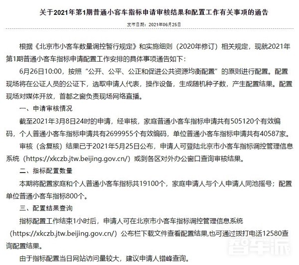 第1期普通小客车指标申请配置工作将于6月26日10:00,按照“公开、公平、公正和促进公共资源均衡配置”的原则进行配置。配置现场将在公证人员的公证下,选取申请人代表,操作设备,生成随机种子数,产生配置结果。配置现场对媒体开放,首都之窗负责现场网络直播。