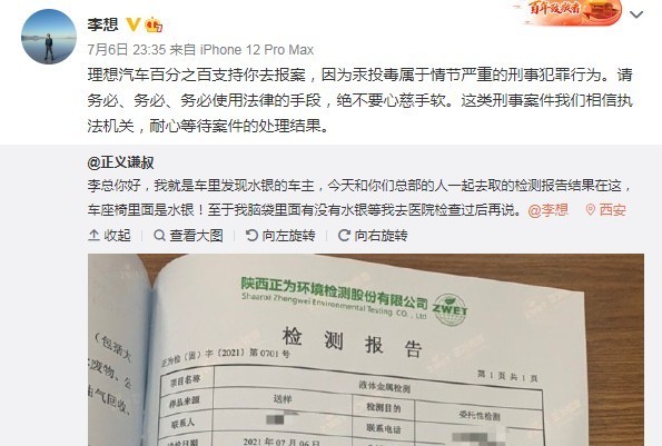 结果公布后,水银事件的车主在微博上@理想汽车CEO李想。李想回应称:“百分之百支持你去报案,因为汞投毒属于情节严重的刑事犯罪行为。请务必、务必、务必使用法律的手段,绝不要心慈手软。这类刑事案件我们相信执法机关,耐心等待案件的处理结果。”
