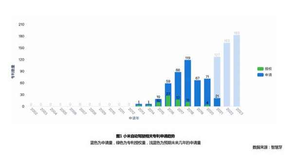相比人才的积累,小米在技术领域布局更早,目前小米自动驾驶相关专利的数量已经有一定的基础。智慧芽在今年6月发布的最新数据显示,在126个国家/地区中,小米涉及自动驾驶的相关专利申请量为446件,主要集中在无人驾驶、车辆控制、车联网、手势控制等方面。令人意外的是,其中发明专利(与之对应的是实用新型专利)的比例高达99.33%。智慧牙预测,2021至2023年小米相关专利申请量将呈快速增长态势。