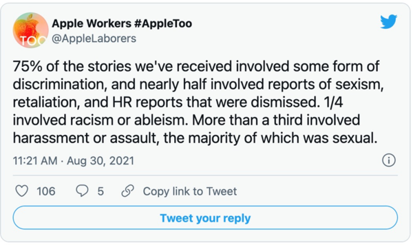 上周,一群苹果员工发起了一个名为Apple Too的职场抗争运动,旨在揭露苹果公司内部长期存在的职场压迫现象。Apple Too有着此前席卷全球的“#MeToo”的影子。但相对于MeToo主要聚焦于职场性骚扰抗争,Apple Too则涵盖了更广泛的职场问题,包括种族主义、性别歧视、不平等、恐吓及骚扰、职场PUA和不受约束的特权等。