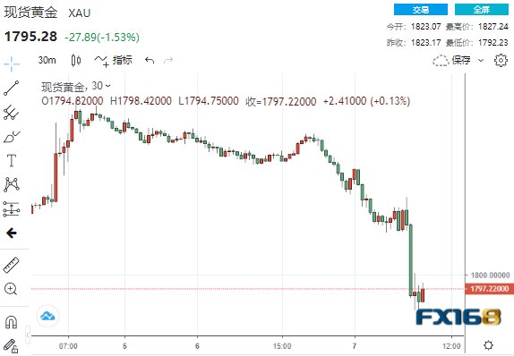 现货黄金短线急跌,自8月27日以来首次下破1800关口,刷新日低至1792.23美元,较日内高位回落35美元。