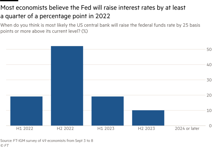 在FT-IGM调查的49位经济学家中,大多数人预计美联储将很快透露加息计划,缩减每月1200亿美元的债券购买计划,然后在2022年完成加息。