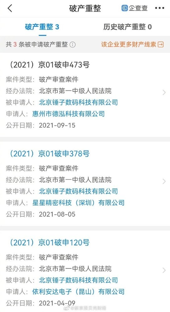 9月15日,企查查APP显示,近日北京锤子数码科技有限公司新增了一条破产重整信息,申请人为惠州市德泓科技有限公司,此次已是该公司第3次被申请破产重整,其中4月份破产清算申请已被撤回。企查查显示,北京锤子成立于2014年,罗永浩任该公司执行董事。