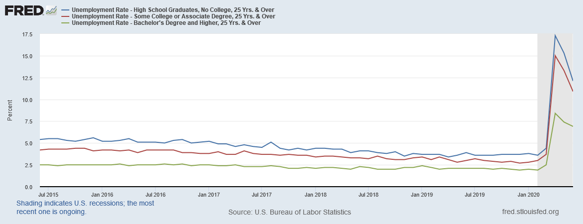 而从失业人士的学历分类来看,目前的失业状况主要集中在那些受教育程度较低的人身上。没有上过大学的高中毕业生的失业率是12.1%(蓝色);对于大学生群体而言(红色),失业率为10.9%。
