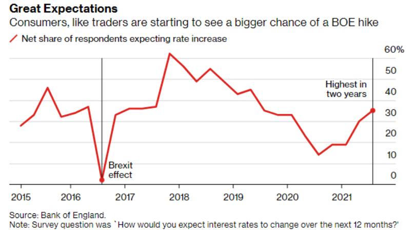 面对不断飙升的消费价格,英国央行正努力证明自己在抗击通胀。最近的一项消费者调查显示,至少在未来五年内,通胀预期仍将高于央行2%的目标。