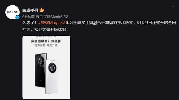 9月22日晚,荣耀举办影像技术发布会正式对外公布了Magic3系列的多主摄融合计算摄影技术,全镜头参与、全焦段融合的理念然人眼前一亮。在发布会上,荣耀CEO赵明宣布,Magic3系列支持多主摄融合计算摄影技术的版本将会在10月进行全网推送,给大家带来高清拍摄体验。不过现在来看,荣耀加快了脚步。