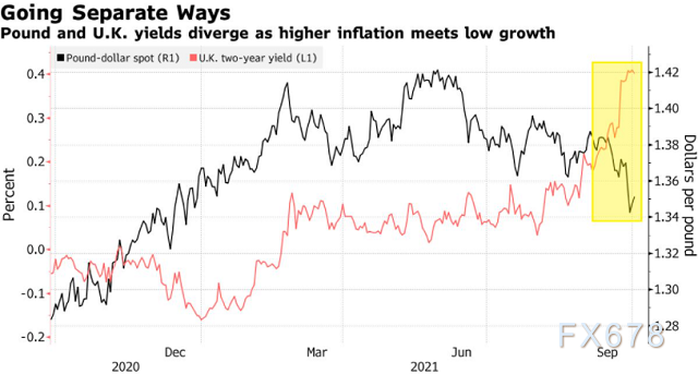 受市场对英国央行提前加息的预期升温提振,英国两年期国债收益率本周攀升至疫情开始以来的最高水平,然而,英镑虽然有所反弹,但仍处于年内低点附近,并遭遇了自3月以来最剧烈的波动。这一迹象表明,能源价格飙升、企业信心下滑和政府休假计划的结束,超过了鹰派货币政策前景带来的提振。随着高通胀与低增长的相遇,英镑和英国国债收益率出现了差异