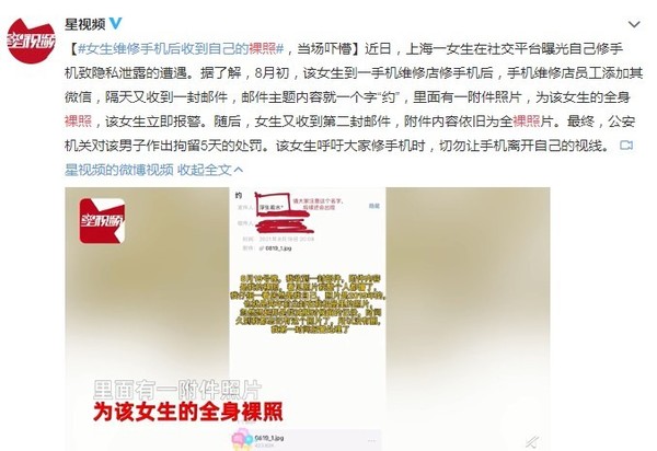 手机隐私要保护好!女生维修手机后收到自己的裸照