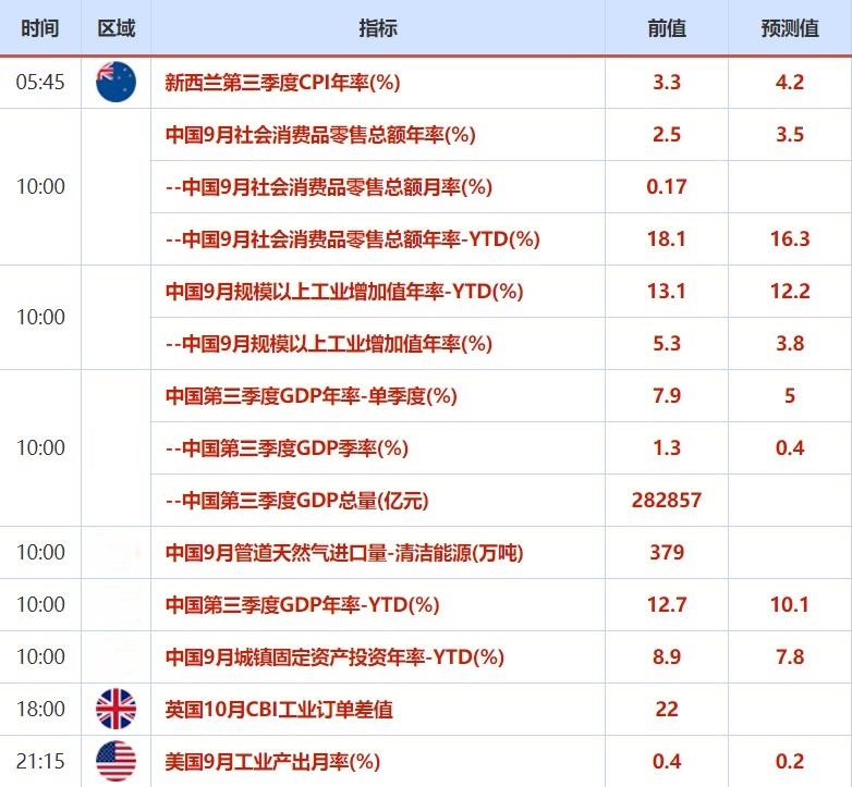 2021年10月已过半,对于下周来说,经济数据和市场消息尤文重要,经济数据方面,将迎来中国第三季度GDP经济数据,英国9月CPI数据,欧美国际9月PMI数据,市场消息方面,美联储金融监管副主席夸尔斯参与金融稳定的讨论,澳洲联储公布货币政策会议纪要,美联储公布经济情况褐皮书都值得重点关注。