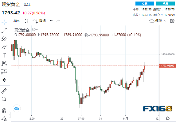 美市盘中,金价小幅升至日高,现货黄金最高触及1795.73美元,较日低拉升近17美元,当日上涨超0.6%。