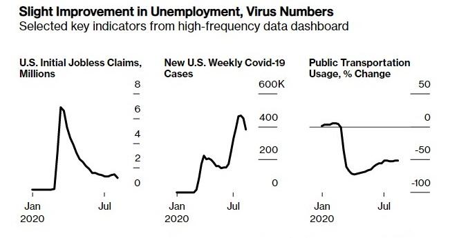 最新的高频数据表明,美国经济复苏停滞一个月后,最终可能会重启复苏之路。感染病例创下疫情爆发后的最小增幅,申请失业金人数也创下疫情期间的低点。此外,消费者信心和航空公司乘客数量也出现改善。但是,里士满联储主席巴金称,因为疫情卷土重来,美国经济仍面临困难,需要更多援助。