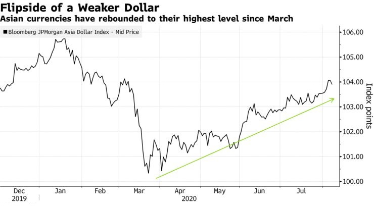 如下图所示,因过去几周美元走软,亚洲货币创下3月份以来高点