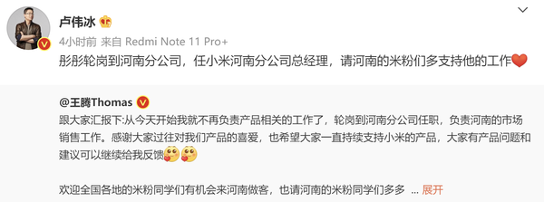 随后小米集团合伙人,中国区、国际部总裁,Redmi品牌总经理卢伟冰转发了这条微博,并且支持到:“彤彤轮岗到河南分公司,任小米河南分公司总经理,请河南的米粉们多支持他的工作。”