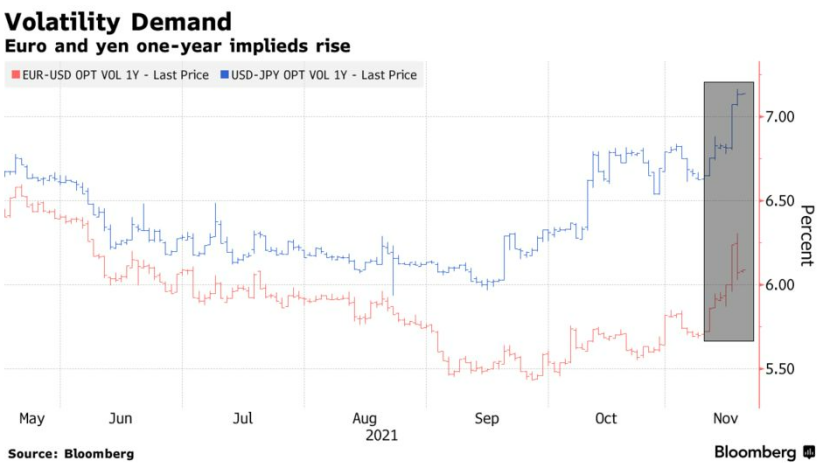 11月24日,是年底前最大规模的期权到期日,有规模约42亿欧元、行权价在1.15的欧元兑美元期权和规模约16亿的欧元奇异期权(注:奇异期权是比常规期权更复杂的衍生品)。另外,还有规模约48亿欧元的奇异期权在12月美联储和欧洲央行会议之后到期。除此之外,年底前没有其他大规模的期权到期日。