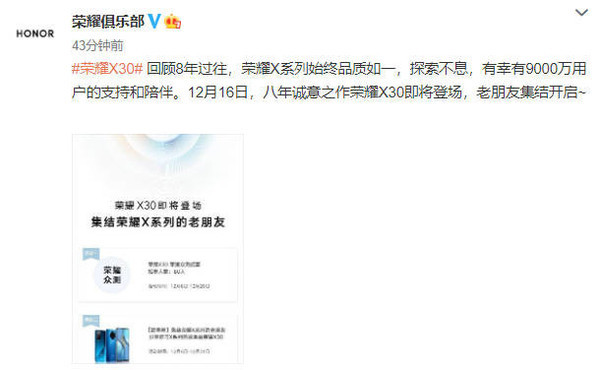 荣耀X30定档12月16日!官方:八年诚意之作即将登场