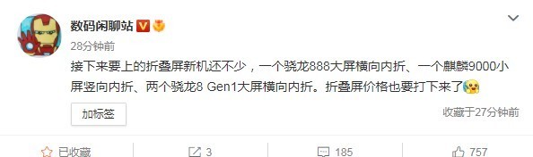12月7日消息,微博一位数码博主爆料,称接下来的折叠屏新机有不少:一款骁龙888大屏横向内折、一款麒麟9000小屏竖向内折、两款骁龙8 Gen1大屏横向内折。他认为,折叠屏的价格可能要打下来了。