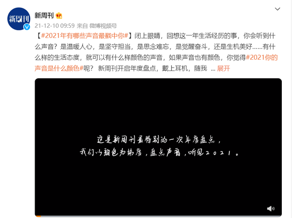 2021年即将结束,如果用声音回顾这一整年,你会如何描述?12月20日,新周刊发布年度话题视频#2021年有哪些声音最戳你#,用声音盘点2021,并为每一种声音赋予不一样的色彩与意义。