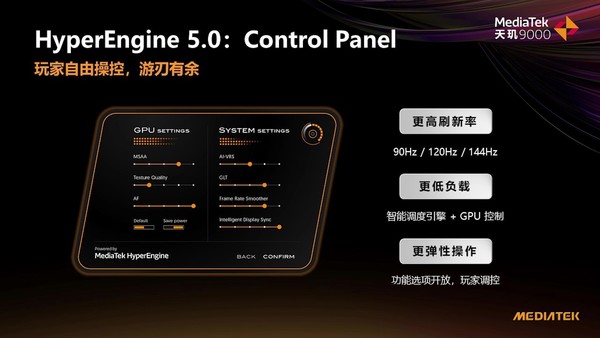 在新一代旗舰 Mali-G710十核GPU的加持下,天玑9000带来了全新升级的 MediaTek HyperEngine 5.0 游戏引擎,在智能调控引擎、网络引擎、画质引擎、操控引擎四大核心特性上,再次带来移动端游戏体验的全面进化。值得一提的是,联发科携手腾讯游戏实验室将“光追”效果正式带入了手游作品上,基于HyperEngine 5.0带来的MediaTek移动光线追踪双引擎,充分发挥GPU渲染能力的同时,结合异构硬件加速器,实现画面降噪的图像后处理,以更低的功耗带来媲美真实的移动端游戏画质。