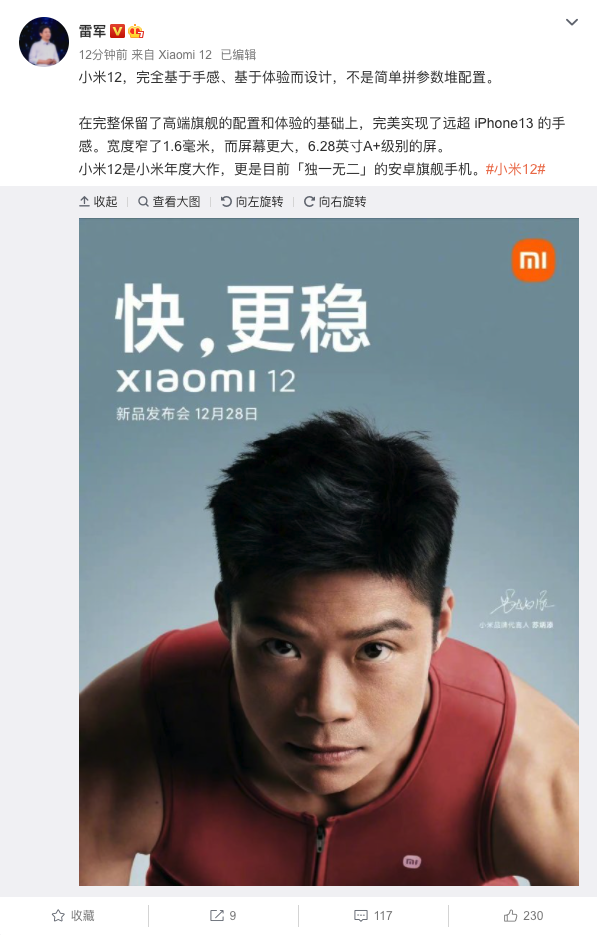 雷军:小米12基于手感和体验设计 不简单拼参数堆配置