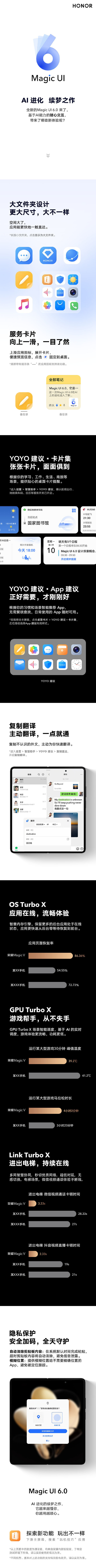 YOYO建议·APP建议,会根据你的习惯和场景智能推荐APP,无需繁琐查找,日常使用的APP随时可用,双指捏合主屏幕,点击桌面卡片-YOYO建议·卡片集,左右滑动选择APP建议布局样式;复制翻译功能,复制不认识的外文,主动为你快速翻译;OS Turbo X保留更多的后台应用处于在线状态,应用更快速从后台零等待恢复到前台;GPU Turbo X带来了更流畅的游戏体验和更低的功耗;Link Turbo X秒切优质网络,超低时延,无感切换。