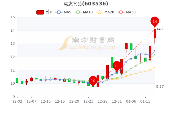 1月13日盘后消息,惠发食品7日内股价上涨7.66%,最新涨9.98%,报14.1元,换手率11.92%。