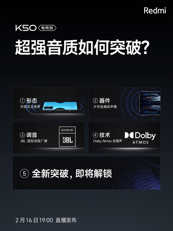 Redmi K50电竞版采用一块OLED柔性直屏,支持120Hz高刷和新一代1920Hz PWM高频调光,相较常规480Hz,调光频率提升3倍,即能保留暗光下的色彩准确,又能解决“低亮度频闪”伤眼问题;配备对称式立体声双扬声器,并且还将采用大号音腔,由JBL进行深度调校,同时还支持杜比全景声技术;搭载全新一代骁龙8移动平台,保证游戏性能充足释放。