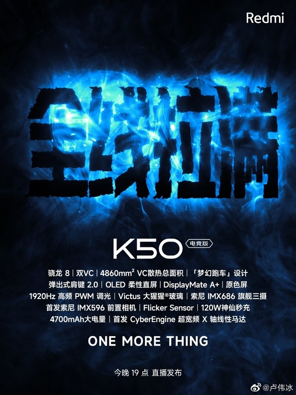 2月16日晚7点,“冷血旗舰”Redmi K50电竞版将正式发布。今天下午,卢伟冰对该机进行了最后的预热,实际上就是回顾了之前K50电竞版的各项配置,关键词是“拉满”。