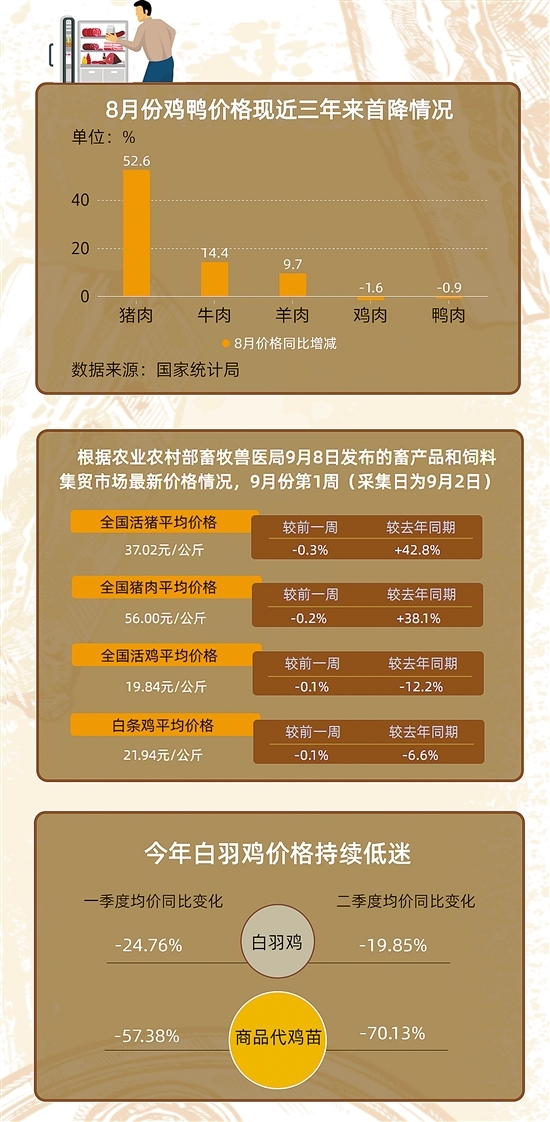 8月CPI数据显示,食品中,受去年对比基数影响,猪肉价格上涨52.6%,涨幅比上月大幅回落33.1个百分点;牛肉和羊肉价格分别上涨14.4%和9.7%,涨幅均有回落;鸡肉和鸭肉价格分别下降1.6%和0.9%,为近三年来首次下降。