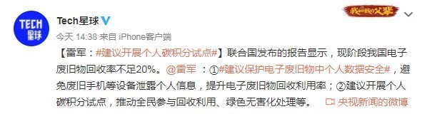 3月6日消息,据报道,作为全国人大代表的小米集团创始人、董事长兼CEO雷军近日提出这几条建议:建议保护电子废旧物中个人数据安全,避免废旧手机等设备泄露个人信息,提升电子废旧物回收利用率;建议开展个人碳积分试点,推动全民参与回收利用、绿色无害化处理等。