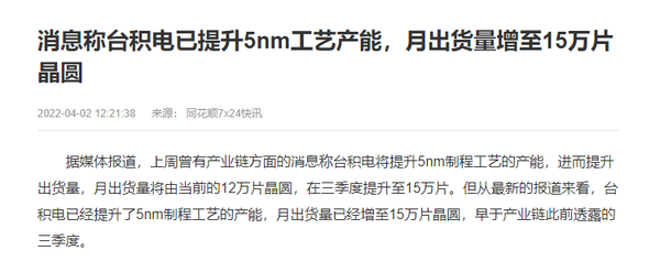 近日,CNMO注意到,有相关媒体表示,有产业链方面的消息称台积电将提升5nm制程工艺的产能,进而提升出货量,月出货量将由当前的12万片晶圆,在三季度提升至15万片。