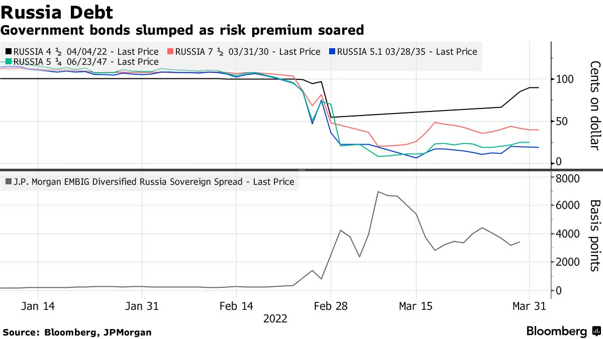 俄罗斯的债券价格已经受到损害。根据外媒编制的数据,今年迄今为止,俄罗斯主权美元票据的价格平均下跌72%,一些到期日债券的交易价格低于20美分,同时,摩根大通公司的数据显示,俄罗斯债券相对于美国国债的风险溢价也飙升至3400个基点以上,远高于被认为陷入困境的水平。