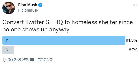 作为一位行业大佬,特斯拉的CEO马斯克时常在Twitter上与诸多网友进行互动。近日,CNMO注意到,马斯克在推特上发起了一项投票,他暗示推特公司可以将旧金山总部改造成收容流浪者的设施,并询问推特网友们是否支持这一项决议。截止目前,有近200万Twitter网友参与了马斯克的投票,结果显示,有超过90.1%的人支持这项提议。