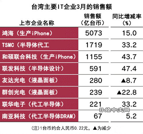 但并非所有台湾IT企业都获得了销售额的增长,生产显示器的企业由于面板价格的下跌以及通货膨胀,都不同程度地受到了影响。其中群创光电减收23%,友达光电减收9%。